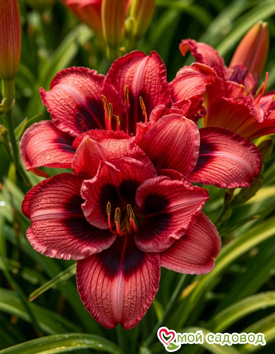 Лилейник (Hemerocallis) — многолетнее травянистое растение, принадлежащее к семейству Ксанторреевые (Xanthorrhoeaceae), хотя в некоторых классификациях его относят к семейству Асфоделовые (Asphodelaceae) или Лилейниковые (Hemerocallidaceae). Его название происходит от греческих слов «hemera» (день) и «kallos» (красота), что отражает основную особенность цветения лилейников: каждый цветок распускается всего на один день. Однако благодаря множеству бутонов на цветоносе цветение одного куста может продолжаться от нескольких недель до нескольких месяцев. Внешний вид и строение: Лилейник представляет собой травянистое растение с корневой системой, состоящей из мощных мясистых корней, служащих для запасания воды и питательных веществ. От этих корней отходят многочисленные пучкообразные линейные или мечевидные листья, образующие прикорневую розетку. Листья, как правило, ярко-зелёные, но у некоторых сортов могут быть сизоватыми или иметь другие оттенки. Они могут быть как узкими, так и широкими, в зависимости от сорта. Высота куста варьируется от карликовых сортов (20-30 см) до высокорослых (100 см и более), что также зависит от сорта. Цветоносы лилейников, как правило, безлистные, прямостоячие и возвышаются над листьями. На верхушке цветоноса формируется несколько бутонов, которые раскрываются по очереди, обеспечивая продолжительное цветение. Цветки лилейников разнообразны по форме, размеру и окраске. Они могут быть простыми (6 лепестков), махровыми (с увеличенным количеством лепестков) или полумахровыми. Форма цветков варьируется от воронковидной до звёздчатой, паукообразной или круглой. Диаметр цветков может варьироваться от 5 до 25 см и более. Окраска цветков лилейников поражает своим разнообразием: от нежно-кремовых и пастельных тонов до ярких красных, оранжевых, желтых, фиолетовых и даже почти черных. Часто встречаются двухцветные и многоцветные сорта с контрастными краями, полосками, глазками (окрашенное пятно в центре цветка) и другими узорами. Лилейники неприхотливы и хорошо растут практически в любых условиях. Они предпочитают солнечные места, но могут переносить и полутень, особенно в жарком климате. Почва должна быть плодородной, хорошо дренированной, с нейтральной или слабокислой реакцией. Уход за лилейниками включает в себя: Полив: регулярный полив в сухую погоду, особенно в период активного роста и цветения. Подкормка: весенняя подкормка комплексным минеральным удобрением для многолетних растений, повторная подкормка после цветения для поддержания здоровья растения. Мульчирование: Мульчирование почвы вокруг кустов помогает сохранить влагу, подавить рост сорняков и защитить корни от перегрева. Обрезка: удаление отцветших цветоносов для поддержания декоративности и стимулирования повторного цветения (у повторноцветущих сортов). Осенью обрезают отмершую листву. Деление кустов: Регулярное деление кустов (каждые 3-5 лет) способствует омоложению растений и сохранению сортовых признаков. Деление проводят весной или осенью. Защита от вредителей и болезней: Лилейники относительно устойчивы к вредителям и болезням, но иногда могут поражаться слизнями, тлей или ржавчиной. При необходимости применяют соответствующие меры защиты. Использование в ландшафтном дизайне: Лилейники широко используются в ландшафтном дизайне благодаря своей неприхотливо